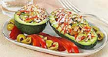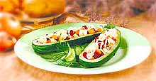 5-6 огурцов. 200г крабовых палочек, 100г голландского сыра, 10-15 оливок, рубленая зелень, майонез, соль – по вкусу. Разрежьте пополам огурцы и удалите мякоть. Натрите сыр на крупной тёрке, палочки мелко порежьте, оливки порежьте колечками, можно добавить немножко мелких кусочков лимона, хорошо перемешайте, добавьте укроп, посолите, заправьте майонезом. Нафаршируйте половинки огурцов и подавайте их охлажденными.