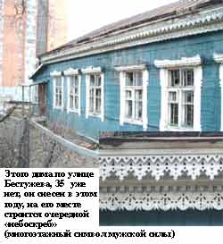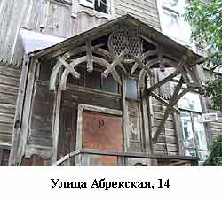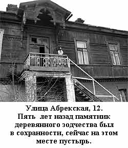 Недалеко от православной церкви, по улице Абрекская, 12, еще недавно стоял дом - великолепный образец деревянного зодчества в стиле модерн. Сейчас на этом месте пустырь. Хозяева, купившие дом, самостоятельно приняли решение о его участи. Что будет на его месте? К счастью, некоторые элементы декоративной резьбы сохраняются на производственной базе одной из реставрационных организаций.