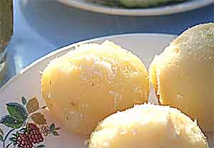На 8 кусков – 2 кг картофеля, 300 г сырокопченой грудинки, 1 л сливок, 2-3 ст.л. муки, зелень-петрушка, укроп. Зеленый лук, соль, перец, слив. масло.