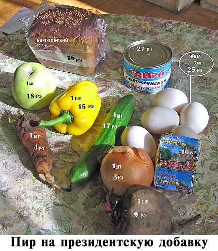 Получила Нинель Павловна президентскую добавку к пенсии и решила 4 ноября помянуть Минина с Пожарским. Как Президент велел. Купила она на эту добавку все, что на фотке рядом расположено. Булочника Минина помянула хлебом (350 гр. -16 рэ) с солью, а князя Пожарского - плавленым сырком.