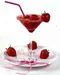 Лед и несколько ягод клубники взбей в блендере или миксере. Добавь немного лимонного сока и минералку с сахаром. Сделай на бокале сахарную каемку (смочи краешек бокала, опусти в сахар), перелей коктейль в бокал, укрась ягодами.