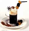 Приготовь кофе, для аромата добавь немного корицы и, если есть, тертого мускатного ореха (не переборщи). Перелей в стакан, добавь шарик ванильного мороженого, взбитые сливки, посыпь тертым шоколадом.