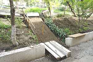 Город, когда прокладывал новые теплосети у нашего дома, восстановил тепловую камеру, разрушив ограждение косогора и лестничный спуск, открыв доступ ливневой воде, разрушающей придомовую территорию и заливающей квартиры цоколя первого подъезда. Куда только ни обращались, чтобы исправить это безобразие и выполнить решение суда от 20.05.2003 года!