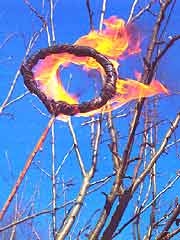 Для обработки высоких деревьев следует подобрать древко как можно легче. Я подобрал дюралевую трубку и к ней прикрепил медной проволокой металлический круг для наматывания на него промасленной ветоши. Распалить пламя лучше всего зажигалкой. Моя практика показала, что самой подходящей для обжига деревьев является ветреная погода. В декабре, январе, феврале на юге Украины дуют сильные восточные ветры. Это как раз то, что надо для обжига... И, естественно, ни в коем случае не следует затягивать обжиг до марта. В наших краях в начале марта, как правило, уже начинается сокодвижение в растениях.