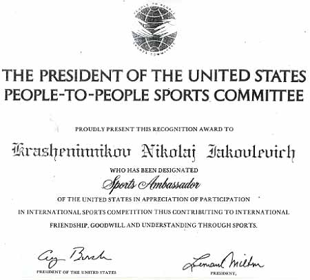 После этого визита следующий президент США Джордж Буш-старший подтвердил полномочия Николая Крашенинникова в качестве посла по спорту этой страны.