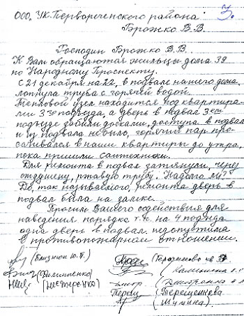 А чтобы понятнее было, как нами собираются управлять, прилагаю заявление жильцов нашего дома к руководителю УК, написанное после аварии в подвале.