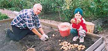 Под посадку делаю канавку шириной в лопату, глубиной - поллопаты (10-15 см) и в середину канавки укладываю мокрые клубни глазками вверх в ряд, между клубнями около 30 см. В эту канавку прямо на клубни насыпаю перегной из трав или навоз, сверху присыпаю землей.