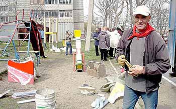 Наконец, третьего мая высадился десант. Юноши и девушки в красных галстуках пионерского образца принялись спешно рыть ямки под элементы детской площадки, попутно объясняя мотивы своего поведения благотворительностью по просьбе населения. Надписи на одежде выдавали принадлежность к «Аркаде». Процесс снимался на камеры.