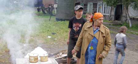 Готовить кушать не на чем. Электропроводка из-за пожара обрезана. Возле дома готовят пищу на кострах, как в первобытном веке. Да и какая там пища? Так, чтобы с голоду не помереть. В бараках в основном живет беднота. А тут еще пожар, последнее сгорело.