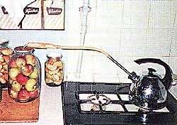 Когда чайник в работе, на нержавеющую трубку длиной 13-15 см надеваю корковую пробку с предварительно проделанным отверстием и вставляю ее в носик. Установка готова.