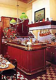 Центром композиции викторианской кухни является место для приготовления пищи и большая, непременно фаянсовая мойка. Плита, как правило, стоит в нише, а над ней располагается большой колпак вытяжки, который поддерживают деревянные или лепные колонны. По всему периметру кухни располагаются массивные деревянные карнизы.