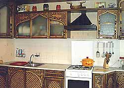 Подобные кухни появились на нашем рынке не так давно. Мебель изготавливают вручную из массива ценных пород дерева. Фасады отделывают нарочито грубо, архаично. Их искусственно состаривают, чернят, наносят древоточины. Резные декоративные элементы придают кухне ярко выраженный национальный характер. Декоративные балки, почерневшие будто от времени, металлические ручки, цепи и гвоздики будут весьма уместны при оформлении интерьера. Разные горшки и плошки, самовар, рушники, фигурки Палеха и Гжели будут отличным дополнением.
