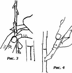 Черенки привоя заготавливают накануне или в день окулировки с заведомо здоровых, урожайных и типичных для сорта деревьев. Не годятся для срезки черенков волчковые жирующие побеги. Оптимальная длина годного на черенки побега 30 - 40 см. Срезанные побеги ставят в ведро с водой. Заготовив необходимое количество, черенки одного сорта связывают в пучок и навешивают на него этикетку. С нарезанными в достаточном (на 1 - 2 часа работы) количестве черенками уходят в прохладное помещение или под навес и здесь удаляют с черенков листья полностью или оставляют черешки длиной в 1 см (рис. 2). Накрывают черенки влажной тряпицей и переносят к месту окулировки.