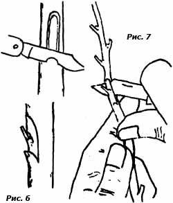 При окулировке вприклад на подвое движением ножа сверху вниз срезают полоску коры с древесиной. При этом лезвие ножа постепенно заглубляют больше и больше. Длина полоски 2,5-3 см. Далее лезвие ножа ставят на 3-4 мм выше нижнего конца надреза под углом 45° и заглубляют лезвие в кору и древесину так, чтобы перерезать отделенную полоску коры с древесиной. Если ее удалить, то на подвое в конце среза заметно клинообразное углубление (рис. 6). Место для щитка готово. Теперь срезают щиток с почкой. Черенок берут в левую руку, но вершиной от себя. Ближе к себе от выбранной почки на 1 -1,5 см ставят нож под углом 45° и заглубляют лезвие в древесину, к себе. Вынимают лезвие из разреза и над почкой (дальше от себя) ставят лезвие почти параллельно. Углубляясь в древесину, движутся к почке и далее до пересечения с поперечным надрезом (рис. 7). Щиток окажется на лезвии ножа, а конец щитка будет иметь форму клина. Щиток вставляют в углубление среза на подвое так, чтобы произошло их полное совмещение (рис. 8). Место окулировки обвязывают полиэтиленовой лентой, причем закрыв ее и саму почку.