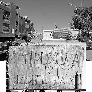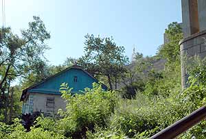 К коттеджу примыкает маленький частный домик, где тоже имеется небольшой частный клочок земли, ставший золотым. И в нем люди все ещё продолжают жить, хотя на них уже летят камни. Но попасть в него не удалось - дорогу преградила строгая надпись.