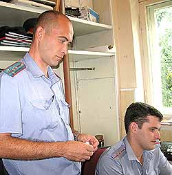 В рабочем кабинете милиции Ленинского района мне удалось застать только нескольких участковых, все остальные в это время уже работали на своих участках: кто-то отправился в больницу опросить избитого гражданина, кто-то в морг - получить свидетельства о смерти, кто-то отрабатывает заявления жителей своего района на участке. Словом, в одиннадцатом часу утра на месте я застала и.о. начальника службы участковых уполномоченных милиции капитана Алексея Андронова, капитана Евгения Романова и капитана старшего УУМ Бачкина Виталия. Участковые оказались немногословными, разговорить их было нелегко.