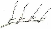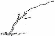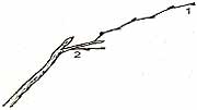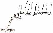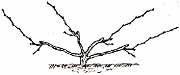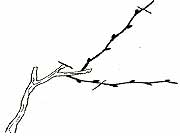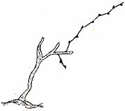 Из четырех плодовых звеньев мы можем «собрать» четырехрукавную веерную формировку, получившую наибольшее распространение (рис. 2). Весной лоза плодоношения подвязывается горизонтально к проволоке шпалеры (рис.3). Из почек во время вегетации вырастают побеги и несущие урожай, и бесплодные. Осенью вся лоза плодоношения (до сучка замещения) удаляется (рис.4) (показано черточкой). А побеги, выросшие на сучке замещения (рис.5), обрезаются: верхний - на лозу плодоношения, нижний - на 2 глазка на новый сучок замещения. И получается картина, изображенная на (рис.6) .