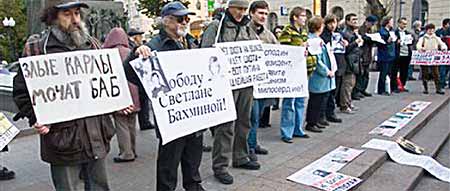 В акции приняли участие более тридцати человек, они собирали подписи под обращением к президенту России Дмитрию Медведеву с просьбой освободить Бахмину. Бывший юрист “ЮКОСа” Светлана Бахмина в 2006 году была приговорена к шести с половиной годам лишения свободы. У неё двое детей, сейчас она находится на седьмом месяце беременности.
