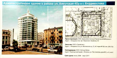 В департамент градостроительства Приморского края поступило извещение ООО «Стройтекс» о начале строительства объекта: «Административное здание в районе Алеутская, 45«А», с пакетом исходно-разрешительной документации. Застройщик — ООО «Новые технологии строительства в Приморье».