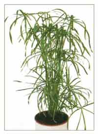 Циперусы – растения очень любопытные и очень древние. Их несколько видов. Из одного из них – циперус папирус – древние египтяне научились делать бумагу. А по библейским преданиям из него была сплетена корзинка Моисея. Но этот вид циперуса трудно содержать дома: его высота может быть до 2,5 метров, ухаживать за ним трудно. Шире распространены другие виды циперуса – раскидистый – дифузос, очереднолистный-альтернифолиус (у него узкие листья до метра в длину). Есть и другие – с узкими листьями с белыми полосами. Есть съедобный циперус высотой в 35 см и с земляными орешками, есть и карликовый грацилис.