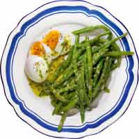 Очистите фасоль от жилок, промойте, нарежьте репчатый лук и выложите всё в посуду. Добавьте сливочное масло, черный молотый перец, влейте несколько ложек бульона и доведите до кипения. Положите кинзу, базилик, петрушку. Фасоль залейте взбитыми яйцами и запеките в духовке. На 1 кг фасоли или 2 банки консервированной – 5-6 ст. л. сливочного масла, 4 яйца, 2 луковицы, зелень петрушки или укропа, соль по вкусу.