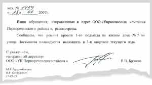 К письму прилагается ксерокопия ответа ООО «Управляющей компании Первореченского района» за подписью В.В. Брожко. В ответе обещано отремонтировать крышу в нашем подъезде в 3-ем квартале 2007 года.