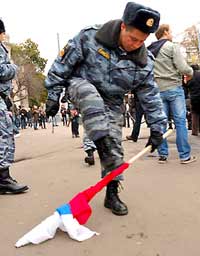Мы до сих пор получаем письма от читателей по поводу конкурса, объявленного в № 46 «АВ». Напомню, мы тогда предложили Вам придумать подпись к фотографии, на которой сотрудник московской милиции топчет российский государственный флаг, отобранный у одного из участников «Русского марша».