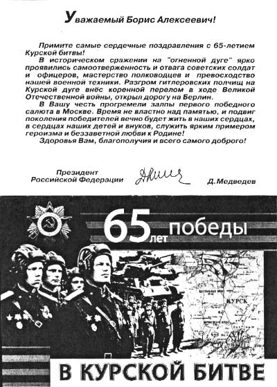 Российский Президент Дмитрий Медведев в нынешнем году лично поздравил ветерана, героя Великой Отечественной войны Бориса Бабия. Потому что в нынешнем году исполнилось 65 лет со дня битвы под Курском, где он сражался, подбил танки, был тяжело ранен и получил награды.