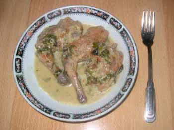 На 1 кг кролика – пара луковиц, полголовки чеснока, морковка, 100 г шампиньонов, граммов 50 сала, стакан сметаны, 1 ст. л. муки, стакан говяжьего бульона, душистый перец, гвоздика, сухие пряные травы, хорошо бы добавить полстакана красного сухого вина, немного растит. масла. Для маринада возьмите полтора стакана воды, ст. л. винного уксуса, лавровый лист, перец горошком, соль и ложку сахара. Разделайте мясо на кусочки и смешайте с нарезанным репчатым луком, измельченным чесноком, залейте маринадом и оставьте на 12 часов. Для маринада смешайте воду с уксусом, добавьте лавровый лист, перец горошком, соль, сахар, пряности и прокипятите. Промаринованное мясо –лучше заднюю часть – нашпигуйте салом и обжарьте на раскаленной сковороде в масле, подсыпая муку для образования румяной корчки. Уложите в утятницу, засыпьте дольками грибов, кружочками моркови, залейте соусом ( сметана, смешанная с мукой), добавьте говяжий бульон (можно из кубика), положите специи: душистый перец, гвоздику, сушеные травы, влейте красного сухого вина и тушите до готовности.