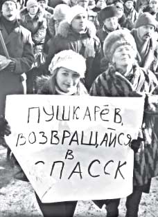 Встала в углу, развернула своё пожелание мэру: «Пушкарёв, возвращайся в Спасск». Люди стали улыбаться. Спустя какое-то время, достали мобильники и фотоаппараты, робко, пытаясь не афишировать свои действия, стали фотографировать. Надо мной на импровизированной сцене какая-то женщина толкала речь: никто не виноват, что произошёл кризис.