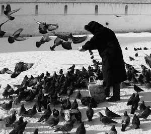 Вдруг передо мной появился молодой охранник лет 23-х в камуфляжной форме. Обратился вежливо: «Бабушка, не корми». На что я ответила: «Но ты же ешь!» Тогда он встал на крохотную горстку перловки и стал топтать ее ногами, не давая голубям проглотить хоть несколько зерен. Я возмутилась, попыталась оттолкнуть парня и произнесла в его адрес несколько неудобоваримых слов. Попыталась внушить ему, что пока молод, надо делать добро.
