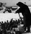 В конце января я побывала на Семеновском рынке на Комарова. С торгового контейнера на улице купила перловку для голубей. Подойдя к другому контейнеру, увидела двух замерзающих, нахохлившихся голубей, сидящих на маленькой планке под крышей. Смотреть на них без жалости было невозможно, и я достала горстку перловки.