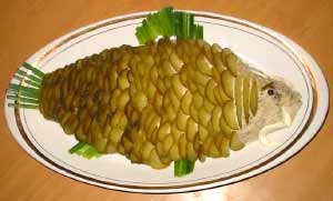 Рыбное филе нарежьте узкими брусочками, посолите, поперчите, обваляйте в муке и обжарьте на раст. масле (перед жаркой их можно сбрызнуть лимонным соком и присыпать приправой для рыбы). Выложите жареное филе на бумажное полотенце или салфетку, чтобы убрать лишнее масло. Лук порезать колечками и обжарить до золотистого цвета. И грибы, нарезав тонкими пластинами, обжарить на растительном масле. На дно широкой тарелки или плоского салатника выложить вымытые и высушенные листья салата, на них – кусочки обжаренной рыбы, полить майонезом. Затем выложить поверх рыбы слой грибов и немного полить майонезом. На грибах распределить кольца жареного лука. А из майонеза сделать сверху узор в виде рыбы. Сверху посыпать все молотым перчиком и дать настояться. Хорошо класть также побольше зелени – петрушки и укропа. Лучше всего такой салат готовить заранее – часов за 12 до подачи, чтоб хорошо настоялся. Кстати, майонез можно разбавить натуральным йогуртом 1:1, тогда вкус будет нежнее. К этой закуске можно добавить слой риса – самым первым, нижним, а остальные слои выкладывать на него. Этот рецепт придумала Елена Тютюникова.