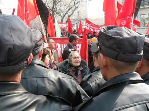 В 11 часов началась демонстрация. Оппозиционеров оградили от проезжей части улицы Светланской еще два кордона милиции. Более того, на тротуаре встала плотной стеной группа неизвестных молодых людей спортивного вида. Кстати, некоторые из этих молодых людей активно мешали работать съемочной группе телеканала НТВ - снимать блокированных оппозиционеров.