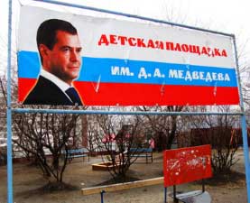 Все же нам удалось сохранить хотя бы детские площадки. И знаете, как? Мы прикрылись Вашим именем, Дмитрий Анатольевич! Мы назвали детскую площадку возле 38 дома Вашим именем, а возле 44 дома – именем премьера В.В. Путина. Заказали растяжки, прикрепили их над входом. Закон не может нас защитить, но защищает Президент – гарант Конституции!