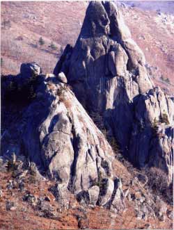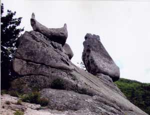 Во многих из этих скульптур можно отчётливо увидеть силуэты животных, живших в далёкие времена. Вот, например, БОЛЬШОЙ ДРАКОН (фото 1). Скальное образование, напоминающее большое пресмыкающееся с огромной головой, высокими горбами и многочисленными шипами на хвосте. Длина изваяния более 800 метров! Голова высотой около 10 метров. Высота горбов – 15-20 метров. Перед большим драконом находится «статуя» малого дракона.
