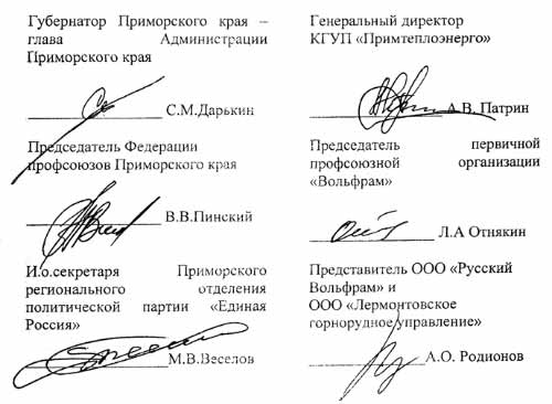 соглашения от 17.06.2009, подписанного от имени Администрации Приморского края, КГУП «Примтеплоэнерго», Федерации профсоюзов Приморского края, первичной профсоюзной организации «Вольфрам», Приморского регионального отделения политической партии «Единая Россия», ООО «Русский Вольфрам» и ООО «Лермонтовское горнорудное управление»