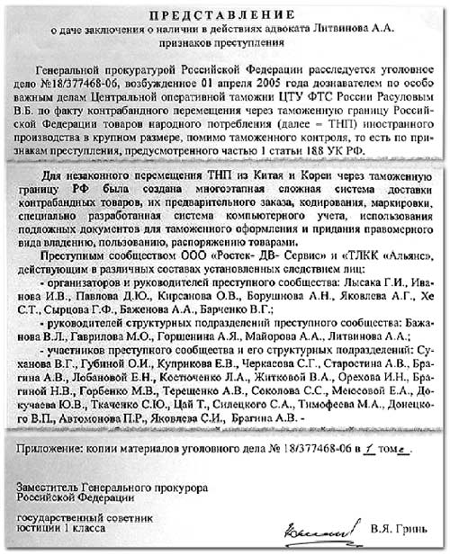 Между тем информация о контрабандной деятельности Геннадия Лысака, которую уже три года подробнейшим образом освещают все СМИ от Владивостока до Москвы, – факт, основанный на документах Генпрокуратуры.