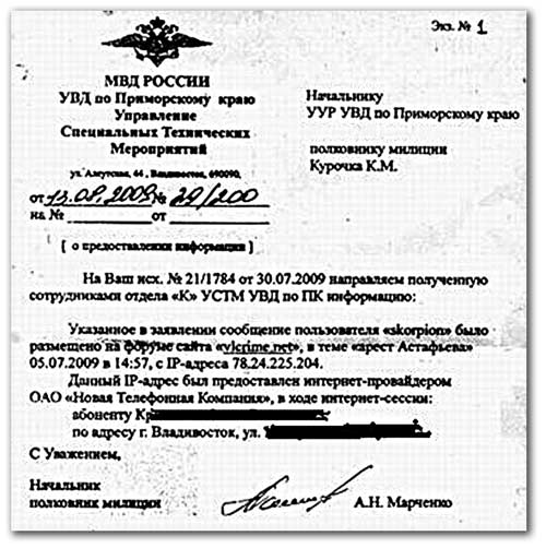 Прочитала журналистка, что про нее пишут «снайперы» на форуме, и бегом отнесла заявление в прокуратуру, чтобы этого неустановленного оскорбителя немедля нашли. Верите? Нашли! Нашелся такой полковник милиции, который не только нашел, но и честно сообщил журналистке, чей домашний компьютер так и сяк на форуме ее обзывает. А обзывался этот компьютер из квартиры дамы, но не простой. Эта дама работает в следственном комитете при прокуратуре Приморского края. Конечно, вроде особо ее упрекнуть не в чем, ежели даже это она сама, а не её престарелые родители, научила компьютер такие сочные сообщения журналистке и полковнику посылать. Ведь прокурорша не в рабочее время со служебного компьютера «на связь выходила». Но журналистка ни в какую, судиться и баста! Ну и закрыли. Нет, не журналистку, форум закрыли. Дней 10 как там пусто было.