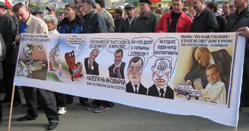 На площади собралось около полутора тысяч человек. В основном молодые люди и среднего возраста, но были и пенсионеры. Поскольку 24 октября – день автомобилиста, понятно, что митинг собрался по поводу автомобильных проблем: техрегламент, бензин, пошлины, резина, дороги… Но на самом деле тематика выступлений (и лозунгов) была гораздо шире. Потому что после прошлогоднего указа о повышении таможенных пошлин на подержанные иномарки произошло много всего…