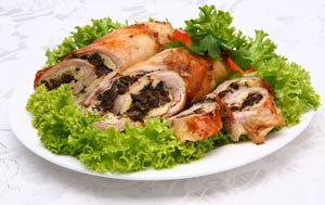 Возьмите крупную курочку, 200-300 г чернослива, столько же грибов, мякоть половины булки, 3 луковицы, 1 яйцо, молоко, растительное масло, сметану, черный перец, молотый мускатный орех, соль по вкусу.