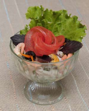 Филе рыбы размять вилкой, огурцы нарезать соломкой. Мелко порезать лук, смешать с грибами, приправить смесью майонеза с горчицей, посолить, перемешать и выложить в салатник. Украсить зеленью петрушки и дольками лимона.