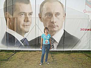 До 2008 года на рекламном щите, расположенном на перекрестке улиц Красный путь и Березовая, висело изображение Путина, который тогда был президентом. После избрания президентом Медведева его фото разместили рядом с фото Путина. Изображения двух лидеров, составляющих правящий тандем в России, провисели на щите вместе около двух лет.