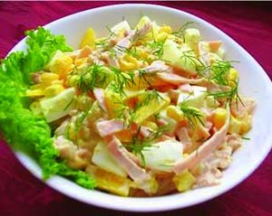 2 яйца вкрутую, 100 г крабовых палочек, полбанки консервированных ананасов, банку кукурузы, 1-2 ст. л. вареного риса, майонез. Измельчите яйца и крабовые палочки, ананасы нарежьте соломкой, добавьте кукурузу и рис. Перемешайте и заправьте майонезом.