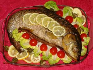 Крупную рыбу очистить, выпотрошить, сделать косые надрезы с обеих сторон тушки и положить в них по пол-ломтика лимона. Рыбу уложить на смазанный жиром лист противня, вокруг – нарезанный кольцами лук, кубики картофеля, кабачки, сверху – нарезанные тонкими ломтиками шампиньоны, посолить, посыпать черным перцем, полить растительным (желательно оливковым) маслом и водой и запечь в духовке. Подавать на этом же листе на стол.