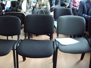 Мест свободных в зале много. Сюда пришла и журналист краевой независимой газеты «Арсеньевские вести» Александра Набокова. В 2 часа дня, то есть к началу заседания Думы, войдя в зал, она прошла и хотела сесть на одно из множества свободных мест.