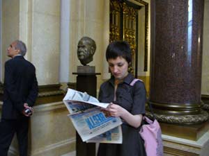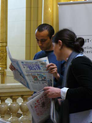 В среду мы прибыли в ратушу для торжественного получения наград. Это событие традиционно проходит 19 мая, в день рождения основателя премии Герда Буцериуса. В холле уже лежали газеты и журналы лауреатов, и наши газеты вызвали самый бурный интерес.