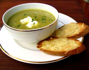 2-3 стебля порея, 3-4 морковки, сельдерея, петрушки порежьте и тушите с 2-3 ст. л. масла, пока не станут мягкими. Затем залейте горячей водой или бульоном, добавьте 3-4 картофелины и соль по вкусу. Готовые овощи можно протереть, разбавить овощным отваром и дать закипеть, затем приправить сливочным маслом. Очень вкусно подавать с гренками, посыпанными тертым сыром и запеченными в духовке.