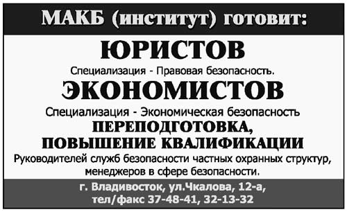 - В прошлом году мы выпустили первый поток студентов из Приморья, - рассказывает Тамара Петровна. - Все выпускники сегодня работают по специальности и руководители предприятий, где они осуществляют свою деятельность, отмечают положительные изменения деятельности в этом направлении. И это не удивительно, ведь наши студенты изучают целый ряд специальных дисциплин, которые не преподают ни в одном другом гражданском учебном заведении России. Эти дисциплины -целая наука о безопасности личности, бизнеса. Наше общество сегодня уже начинает осознавать, что заниматься безопасностью должны профессионалы. Слишком много происходит трагедий, причем таких, которых могло не быть. Если бы службы безопасности предприятий и руководители лучше знали свое дело. Пока же в общей массе должности руководителей служб безопасности в организациях занимают бывшие работники милиции и правоохранительных органов. И их компетентности, к сожалению, не всегда хватает. Есть много примеров, подтверждающих мои слова. Именно поэтому также количество желающих повысить свою квалификацию и получить второе высшее образование в нашем вузе растет. Мы открыты для всех, неважно кто ты -уволившийся в запас военнослужащий или вчерашний школьник; выпускник училища или колледжа, мужчина или женщина. Более того, МАКБ тесно сотрудничает с теми фирмами, обеспечение безопасности для которых - профессиональная обязанность. Это охранные агентства, службы безопасности предприятий, налоговые органы, юридические и правовые структуры, структуры системы ГО и ЧС. Самые компетентные их представители работают с нашими студентами.