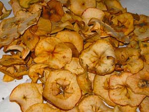 Когда плоды потеряют около 2/3 влаги, температуру снижают до 50-55°С. Вся сушка продолжается примерно 5-6 ч и считается законченной, если кружки или дольки при сильном нажиме пальцем не раздавливаются. Недосохшие яблоки снимают с противня или сита и повторно сушат. Готовые яблоки выдерживают в коробке или ящике в течение недели для выравнивания влажности. Хорошо высушенные яблоки должны быть эластичными, от светло-кремового до светло-коричневого цвета.